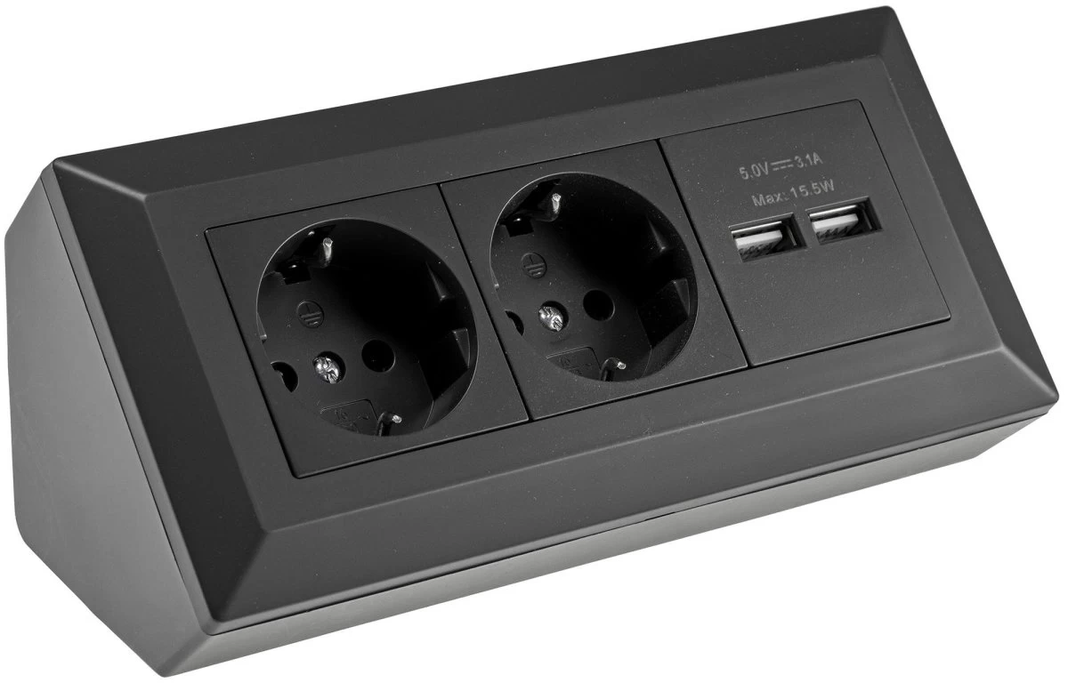 2-fach Steckdosenblock + 2x USB, schwarz 250V~/ 16A, Aufbaumontage, USB 3,1A