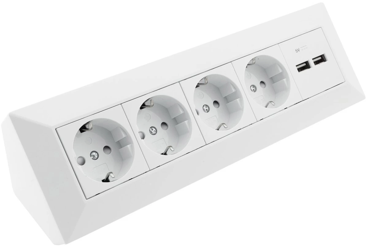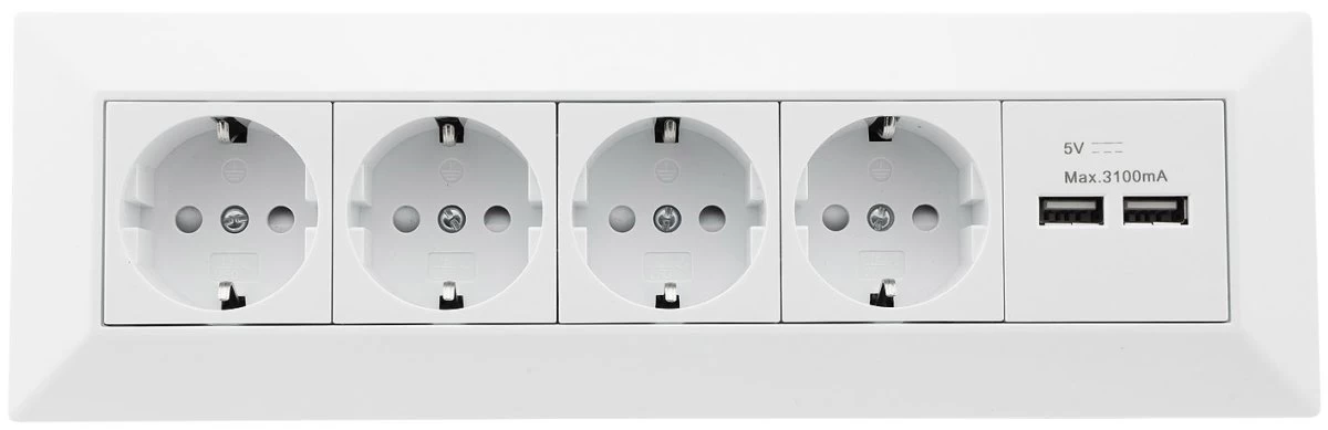 Aufbau-Steckdose mit 4 Schutzkontakt-Steckdosen und 2x USB 5V Ladeports. Front 45° gewinkelt für optimale Ausnutzung der Steckplätze. Dreieck Design entworfen und konstruiert um auf den Arbeitsflächen mehr Platz für das Wesentliche zu schaffen. Das Gehäuse ist um 90° gewinkelt und ideal für die Installation in Ecken, Auf Arbeitsflächen oder als Unterbausteckdose unter dem Küchenschrank.