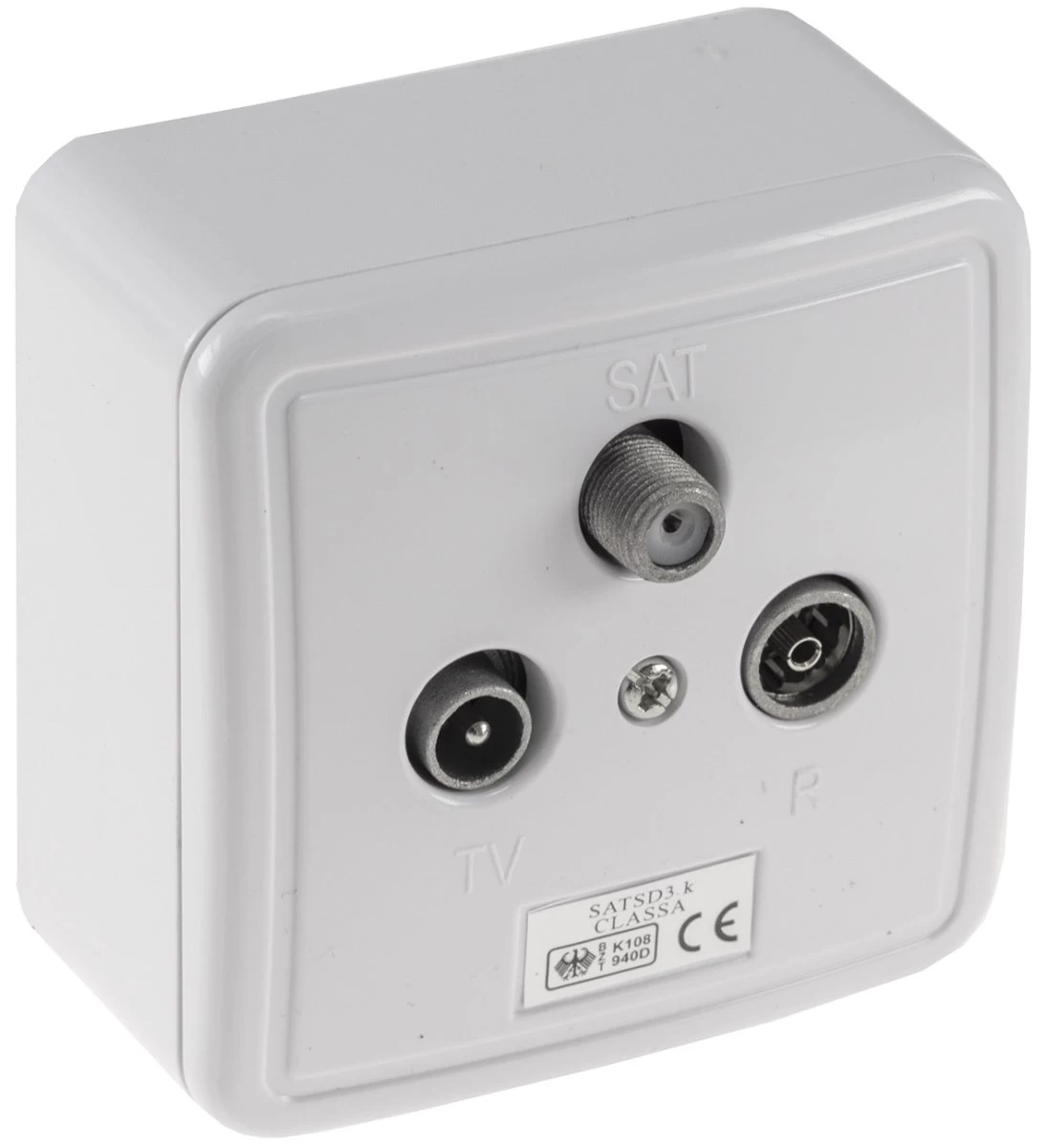 Universal-Antennendose für Satelliten- & BK-Anlagen und Rundfunk. Sonderkanal- und Rückkanal-tauglich. Ausführung als Stich-/Enddose, 1dB Dämpfung. Lieferung komplett mit Aufputzrahmen und Abdeckung.