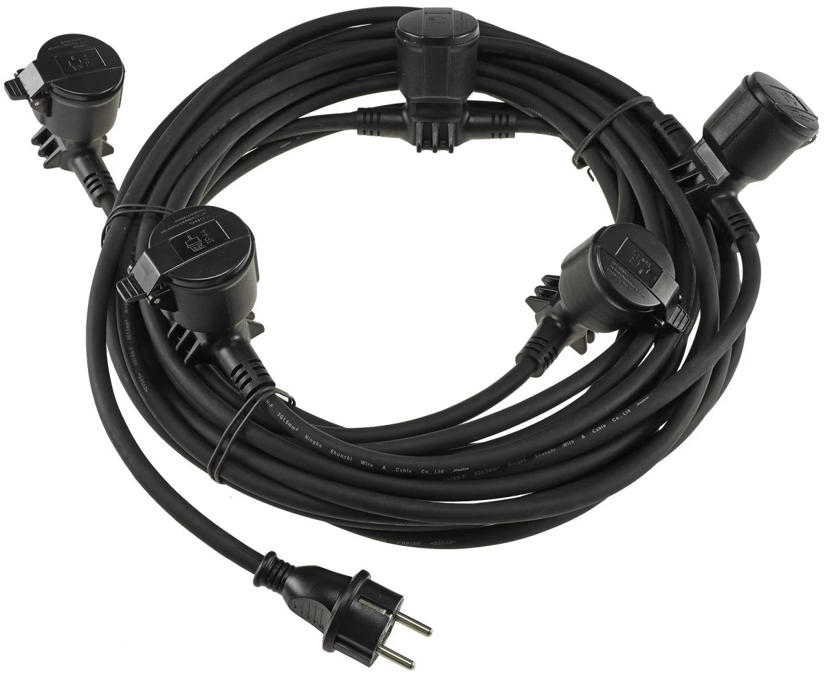 Pfiffige Lösung zum Anschluss mehrer Garteleuchten: Bei dieser Netzleitung sind 5m Kabel vom Schutzkontaktstecker bis zur ersten Steckdose vorhanden, je 4x 2,5m verlängern die Stromzufuhr zu 4 weiteren Steckdosen. Top-Lösung, um z.B. mehrere Leuchten um einen kleinen Teich zu positionieren.