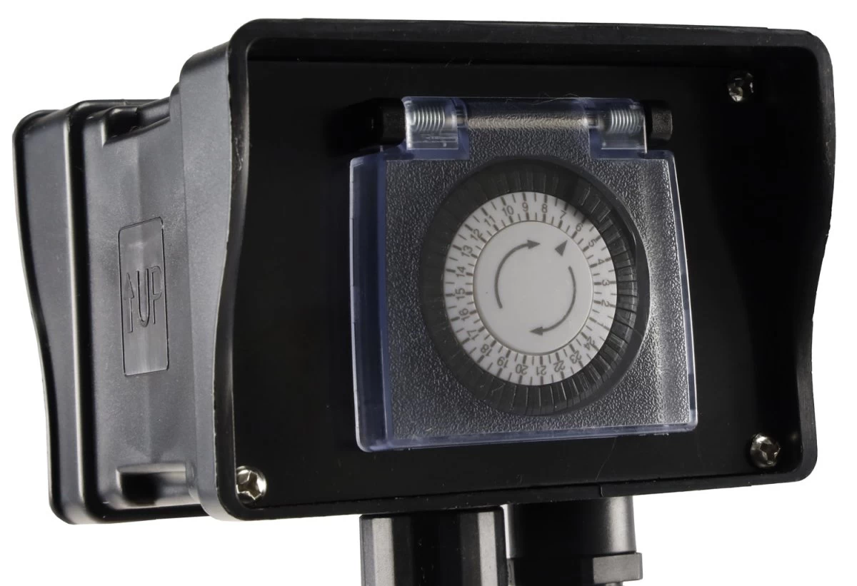 Elegante Gartensteckdose mit Erdpieß und praktischem Timer zur Steuerung von z.B. Teichpumpen oder Ihrer Terrassen- & Gartenbeleuchtung. Die aus witterungsbeständigem Kunststoff gefertigte Steckdose ist dank angeschlossener Netzleitung sofort und überall einsetzbar.