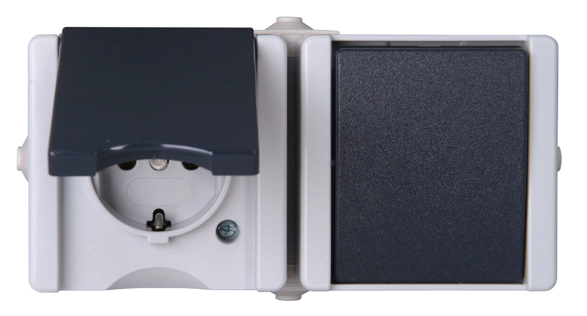Aufputz-Feuchtraum, Aus-/Wechselschalter-Steckdosenkombination, waagerecht, ohne Berührungsschutz (Kinderschutz), 10AX/16A, 250V~, proAQA, hellgrau/dunkelgrau EAN: 4008224586597