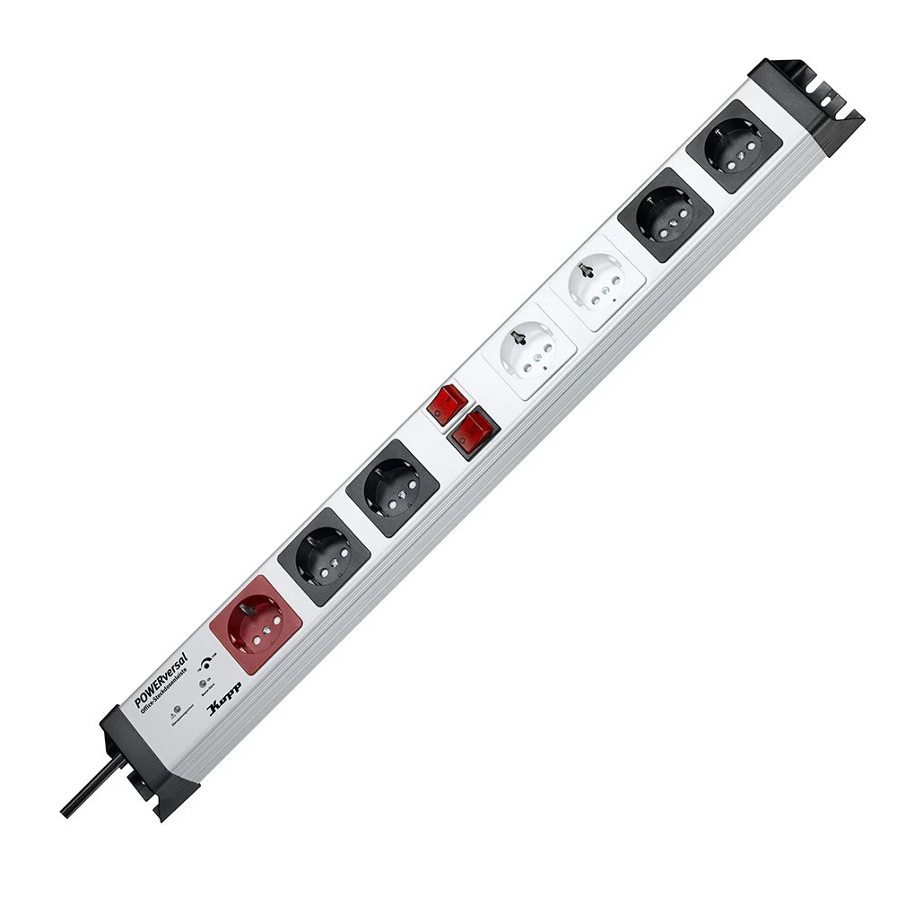 • Diese Steckendosenleiste enthält einen erhöhten Berührungsschutz und 90° gedrehte Töpfe