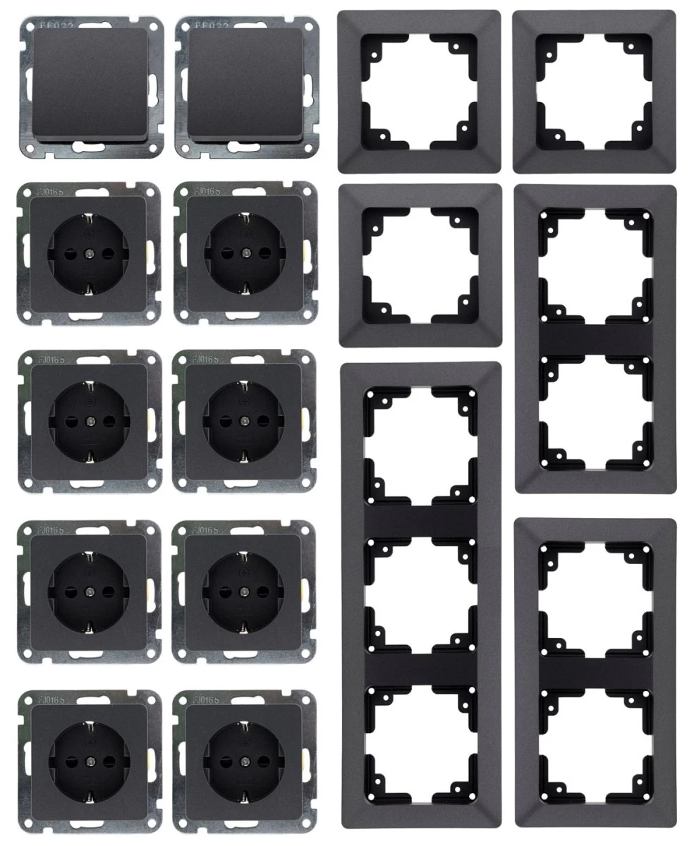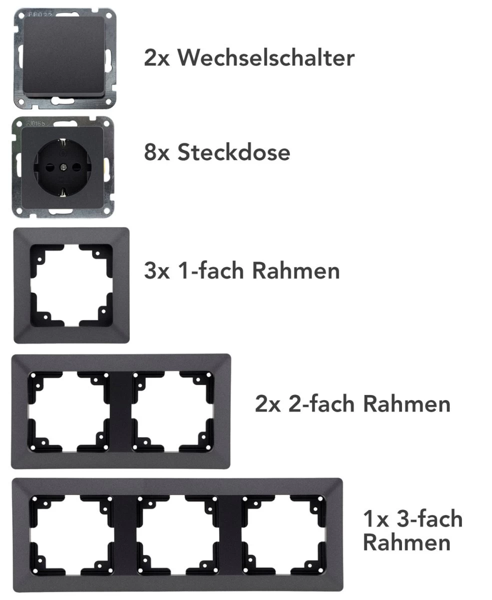 MILOS Starter 16-tlg „PRO“, Anthrazit 8x Steckdose, 2x Schalter, Steckanschlus