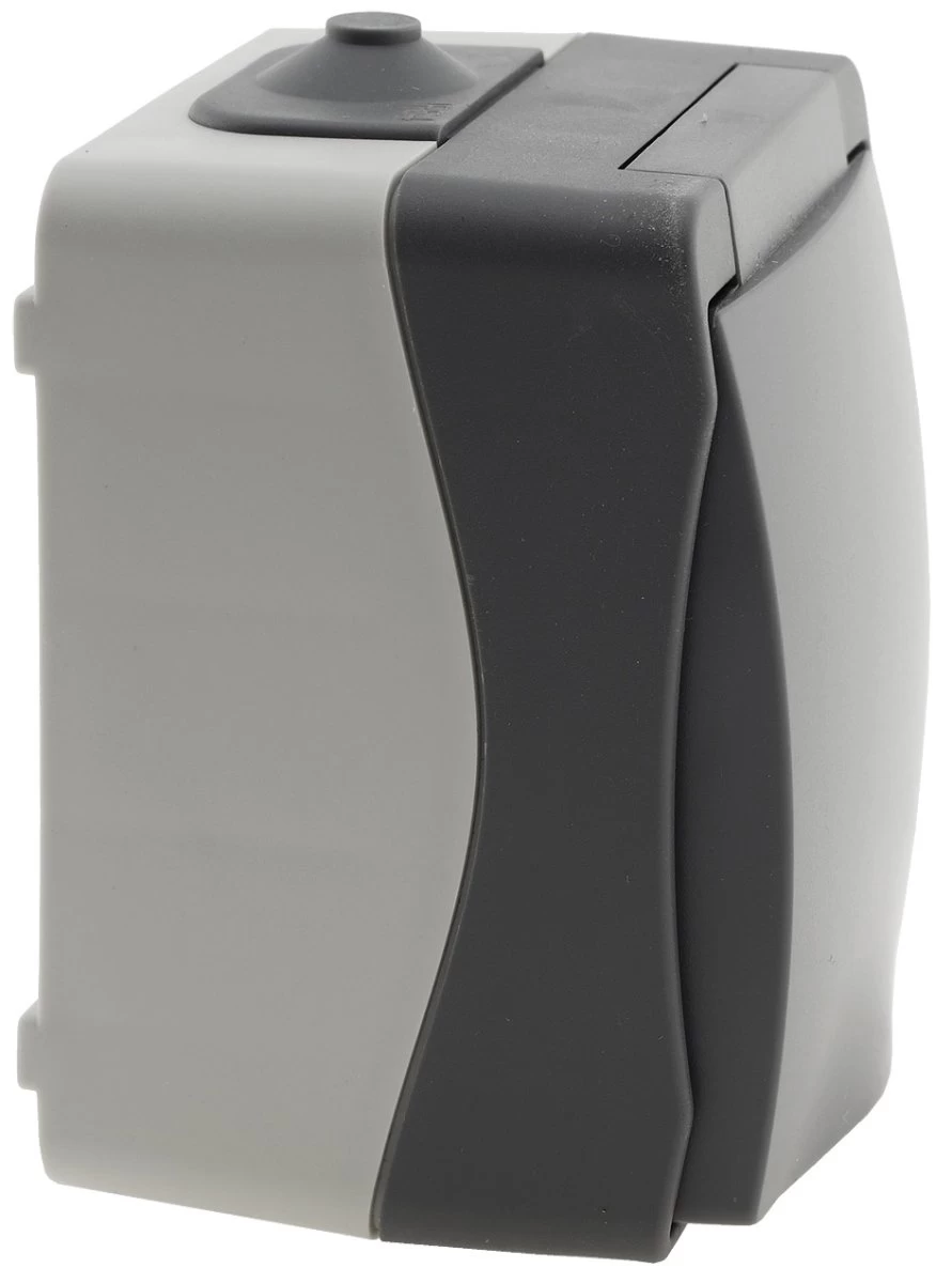 Spritzwassergeschützte Schutzkontakt-Steckdose in elegantem Design und wertigem Finish. Zweifarbiger Aufputz-Rahmen mit dunkelgrauem Deckel mit Federschließung.