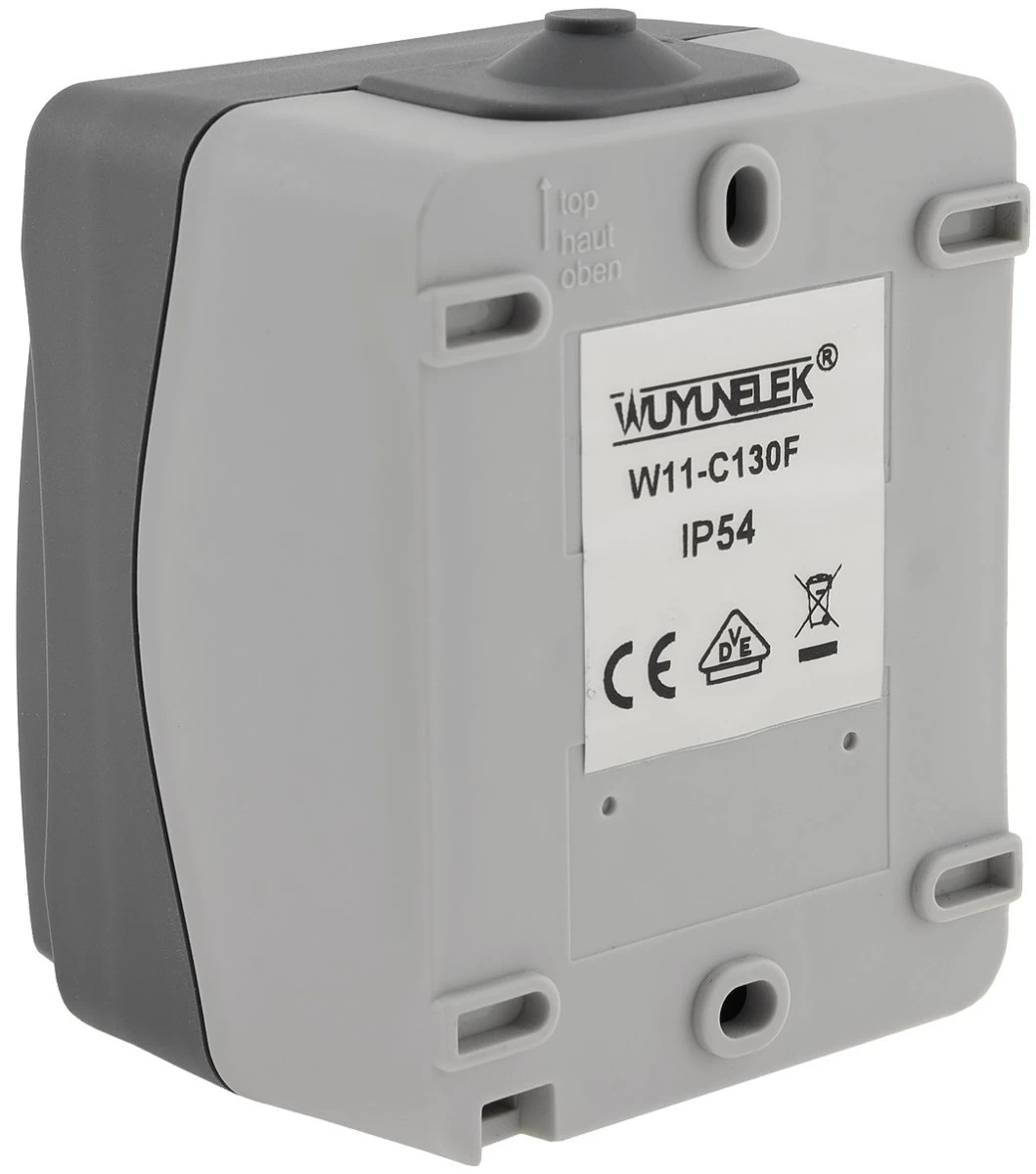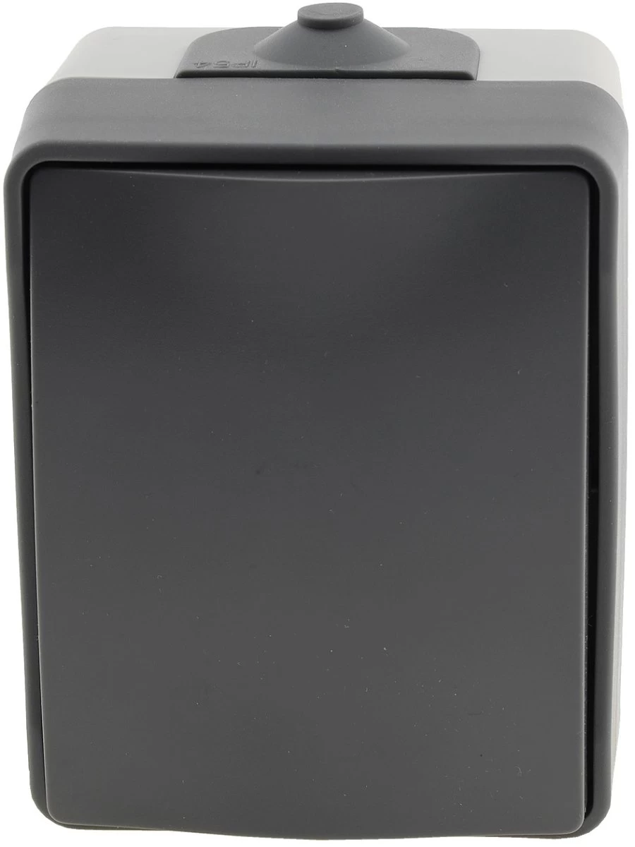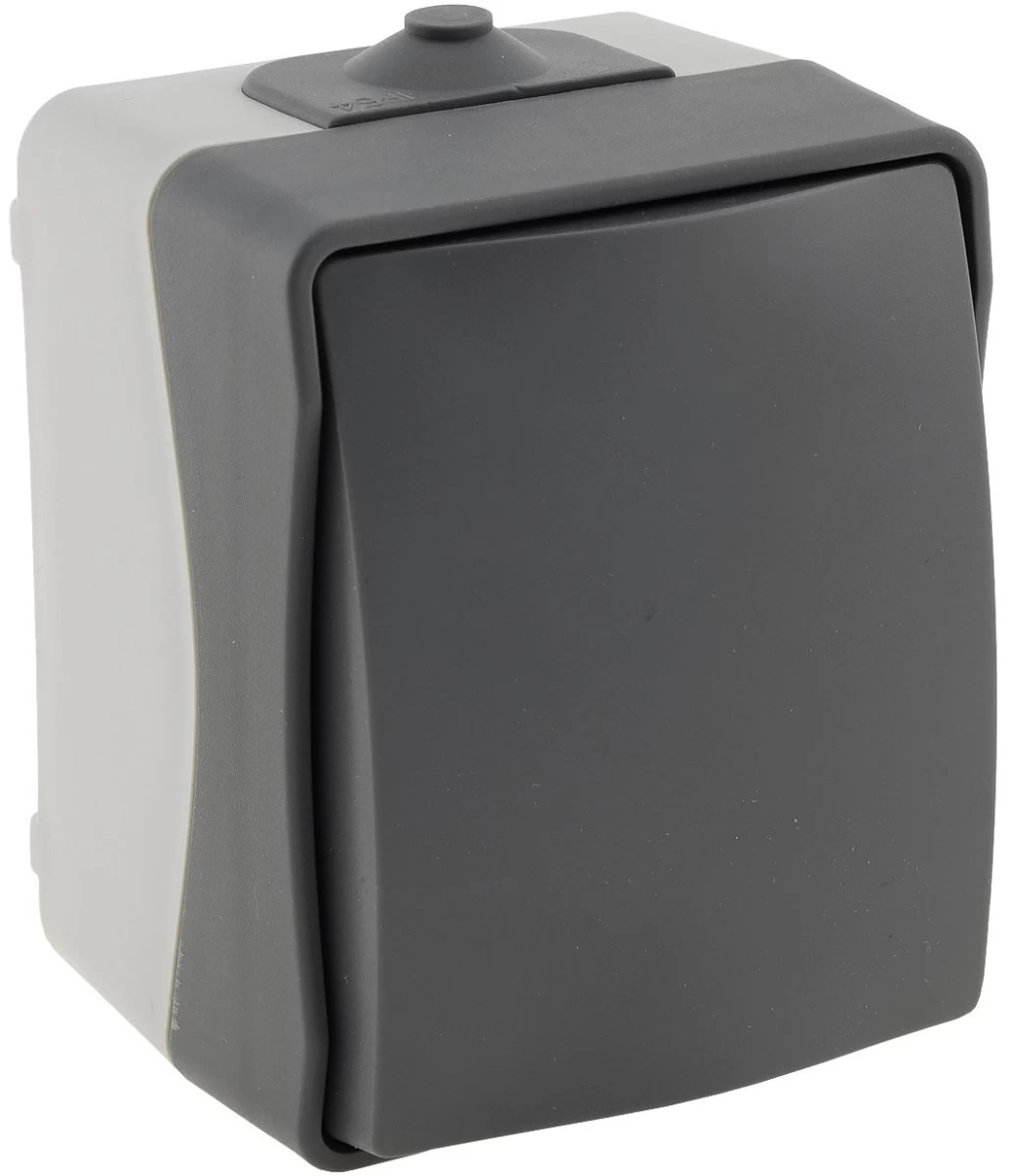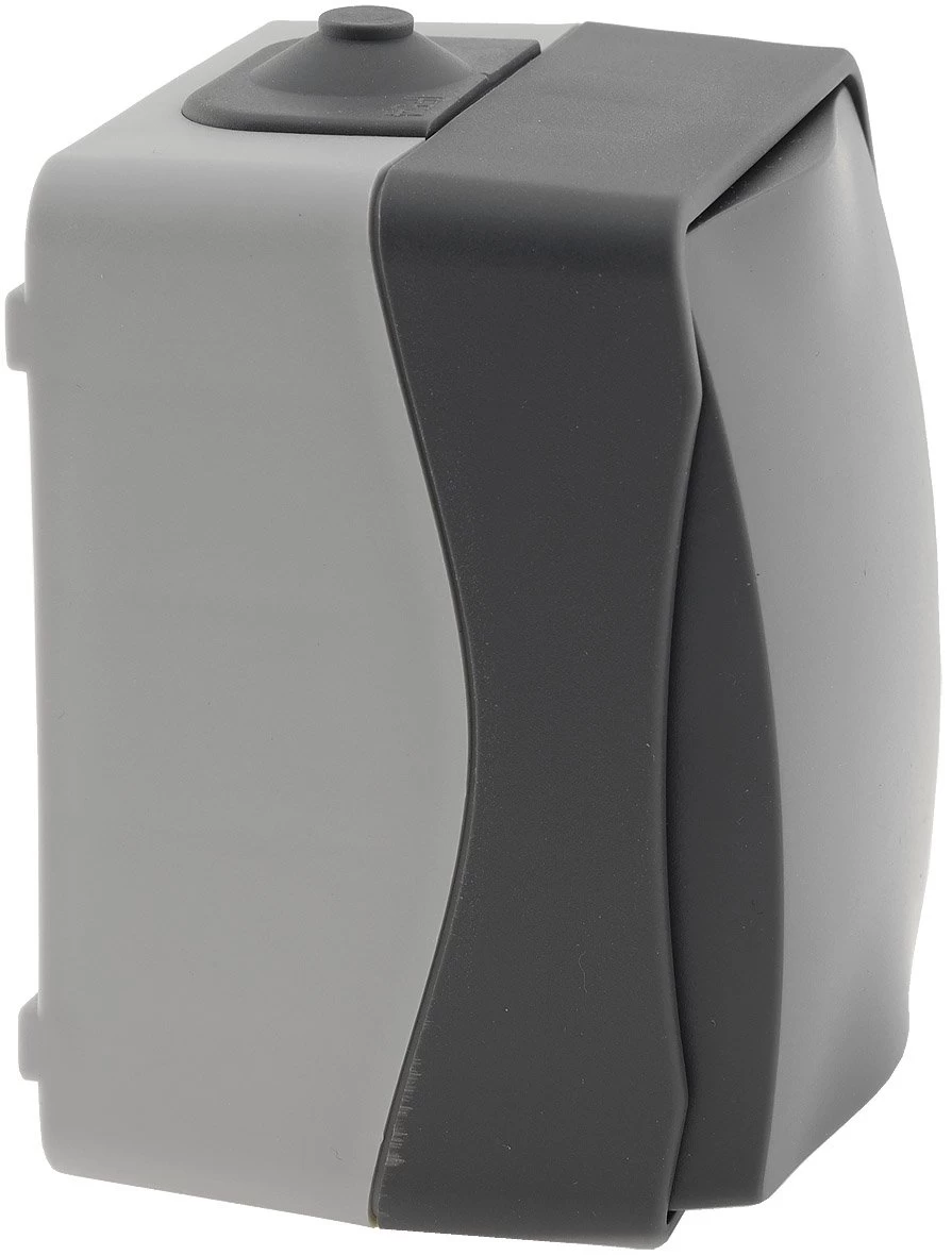 Spritzwassergeschützter Taster in elegantem Design und wertigem Finish. Zweifarbiger Aufputz-Rahmen mit dunkelgrauem Deckel.