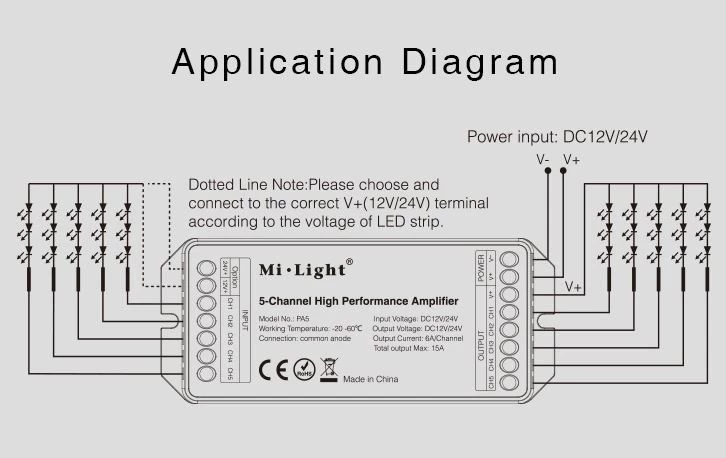 Product Name: 5-Channel High Performance Amplifier Model No.: PA5 Work Temperature: -20~60? Input Voltage: DC12/24V Output Voltage: DC12/24V Output Current: 6A/Channel Total output Max: 15A Switching Rate: 10Mbps Connection: Common anode Product Size: 115*48*27mm