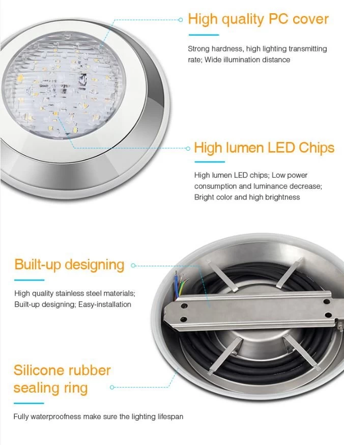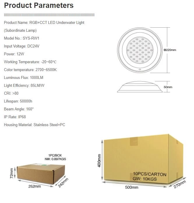Product Name: RGB+CCT LED Underwater Light (Subordinate Lamp) Model No.: SYS-RW1 Input Voltage: DC24V Power: 12W Working Temperature: -20~60° Color temperature: 2700~6500K Luminous Flux: 1000LM Light Efficiency: 85LM/W CRI: >80 Lifespan: 50000h Beam Angle: 160° IP Rate: IP68 Housing Material: Stainless Steel+PC